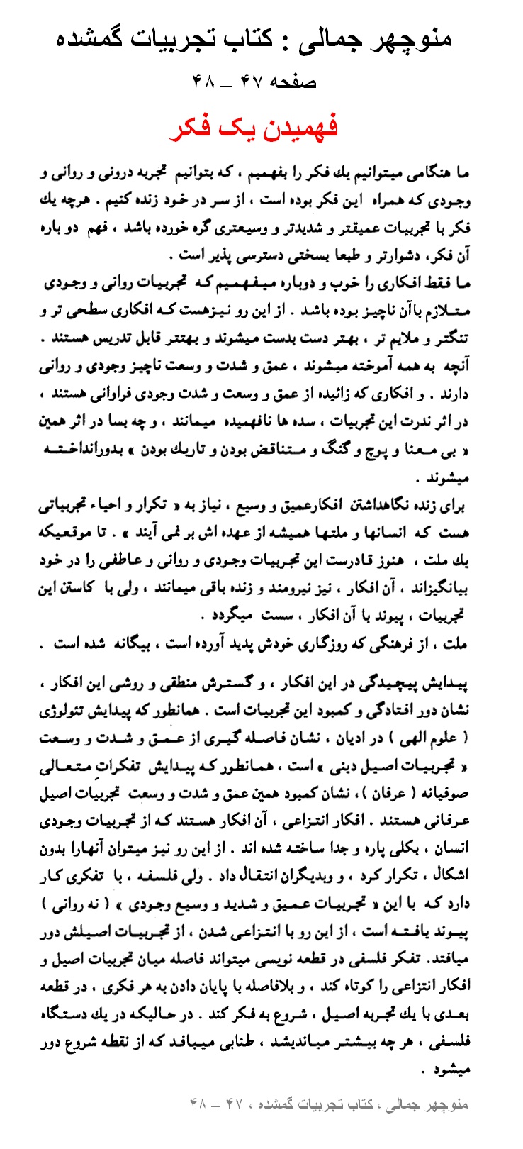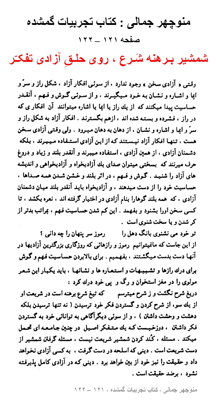 منوچهر جمالی : کتاب تجربیات گمشده ، صفحه ۱۲۱ – ۱۲۲ ، شمشیر بـرهنه شَـرع ، روی حلـقِ آزادی تفکـّر + صفحه ۴۷ – ۴۸ ، فهمیدن یک فکر