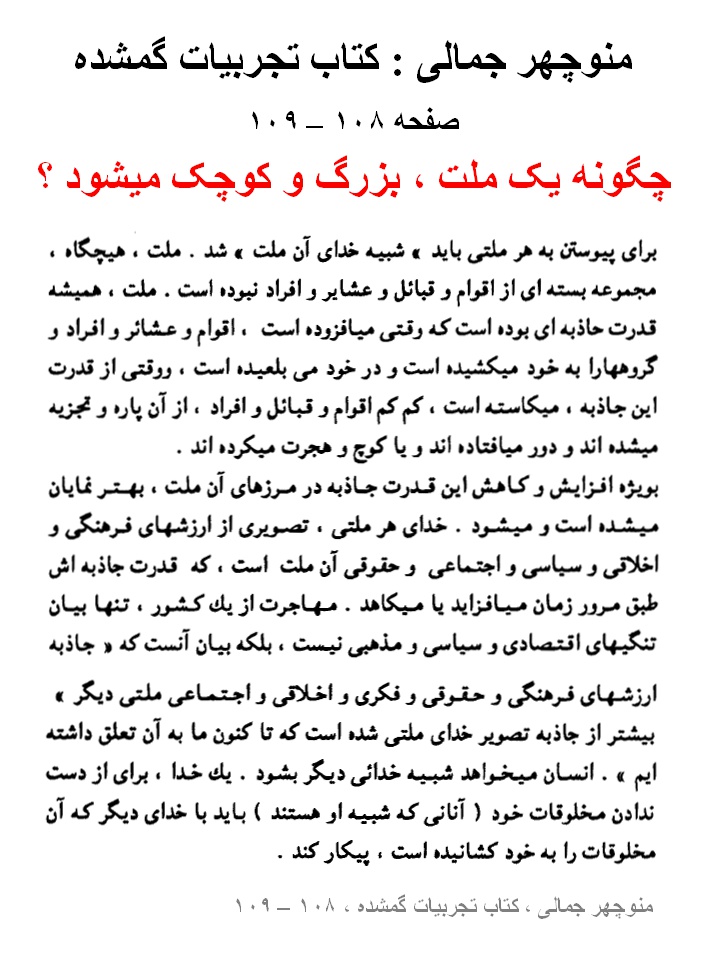 دستهها از نو سبز و تازه شویم منوچهر جمالی : کتاب تجربیات گمشده ، صفحه ۲۱۷ – ۲۱۸ ، ایران باید از نو زائیده شود + صفحه ۱۰۸ – ۱۰۹ ، چگونه یک ملت ، بزرگ و کوچک میشود ؟ نویسندهٔ نوشته از Palang LY تاریخ نوشته اکتبر 6, 2011 هیچ دیدگاهی برای منوچهر جمالی : کتاب تجربیات گمشده ، صفحه ۲۱۷ – ۲۱۸ ، ایران باید از نو زائیده شود + صفحه ۱۰۸ – ۱۰۹ ، چگونه یک ملت ، بزرگ و کوچک میشود ؟ ثبت نشده منوچهر جمالی : کتاب تجربیات گمشده صفحه ۲۱۷ – ۲۱۸ ، ایران باید از نو زائیده شود + صفحه ۱۰۸ – ۱۰۹ ، چگونه یک ملت ، بزرگ و کوچک میشود ؟ *** ادامه … *** ← محمد حسین یحیایی : نمک دریاچه اورمیه و زخم رژیم درمانده → بهرام رحمانی : طرح حکومت اسلامی برای اخراج صدها هزار افغانی از ایران! دیدگاهتان را بنویسیدبرای نوشتن دیدگاه باید وارد بشوید.