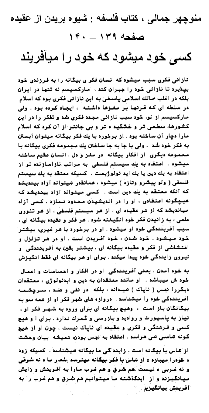 دستهها از نو سبز و تازه شویم منوچهر جمالی ، کتاب فلسفه : شیوه بریدن از عقیده – صفحه ۱۳۹ – ۱۴۰ – کسی خود میشود که خود را میآفریند نویسندهٔ نوشته از Palang LY تاریخ نوشته آگوست 16, 2011 هیچ دیدگاهی برای منوچهر جمالی ، کتاب فلسفه : شیوه بریدن از عقیده – صفحه ۱۳۹ – ۱۴۰ – کسی خود میشود که خود را میآفریند ثبت نشده منوچهر جمالی ، کتاب فلسفه : شیوه بریدن از عقیده صفحه ۱۳۹ – ۱۴۰ کسی خود میشود که خود را میآفریند ← منوچهر جمالی ، کتاب فلسفه : شیوه بریدن از عقیده – صفحه ۹۶ – ۹۸ – آیا بازدودن خرافه ، به حقیقت میرسیم ؟ → محمود کوير : گبر و مجوس و جهود و ترسا؛ در آینهی شعر پارسی دیدگاهتان را بنویسیدبرای نوشتن دیدگاه باید وارد بشوید.