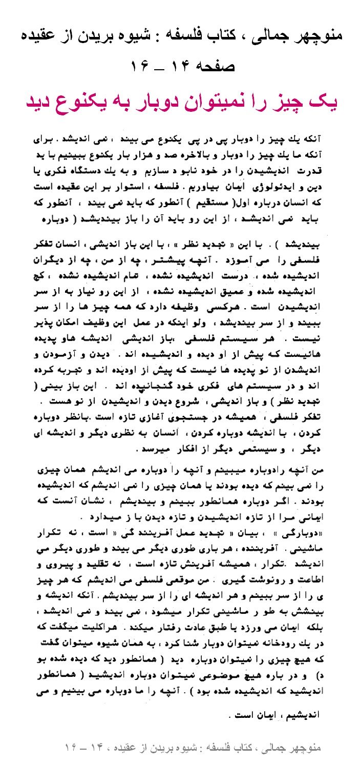 منوچهر جمالی ، کتاب فلسفه : شیوه بریدن از عقیده ، صفحه ۱۴ – ۱۶ ، یک چیز را نمیتوان دوبار به یکنوع دید صفحه ۱۷ ، زندگی در یک دستگاه فکری نمیگنجد