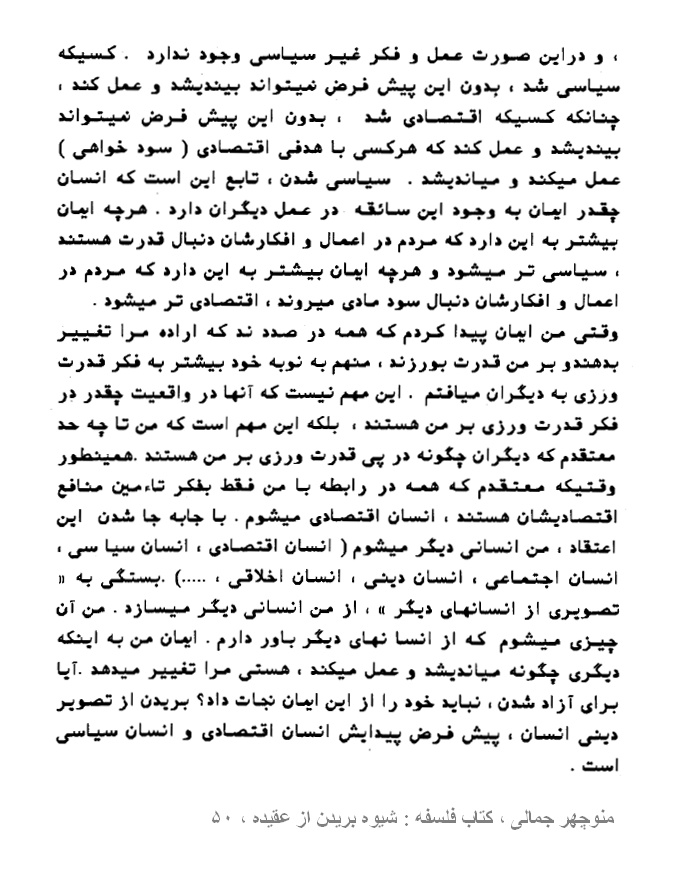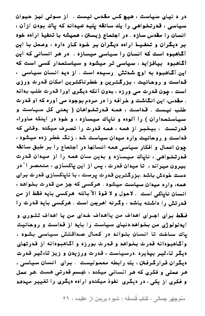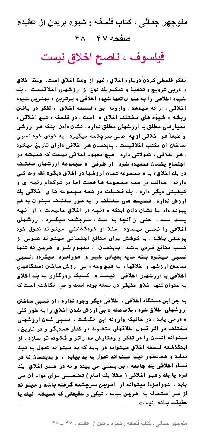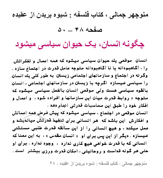 منوچهر جمالی ، کتاب فلسفه : شیوه بریدن از عقیده ، صفحه ۴۷ – ۴۸ ، فیلسوف ، ناصح اخلاق نیست + صفحه ۴۸ – ۵۰ ، چگونه انسان، یک حیوان سیاسی میشود