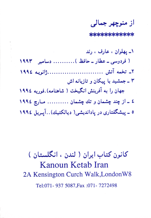 [S04] 110 pp. Kanoune Ketab Ltd., London, 1994. € 10,00.